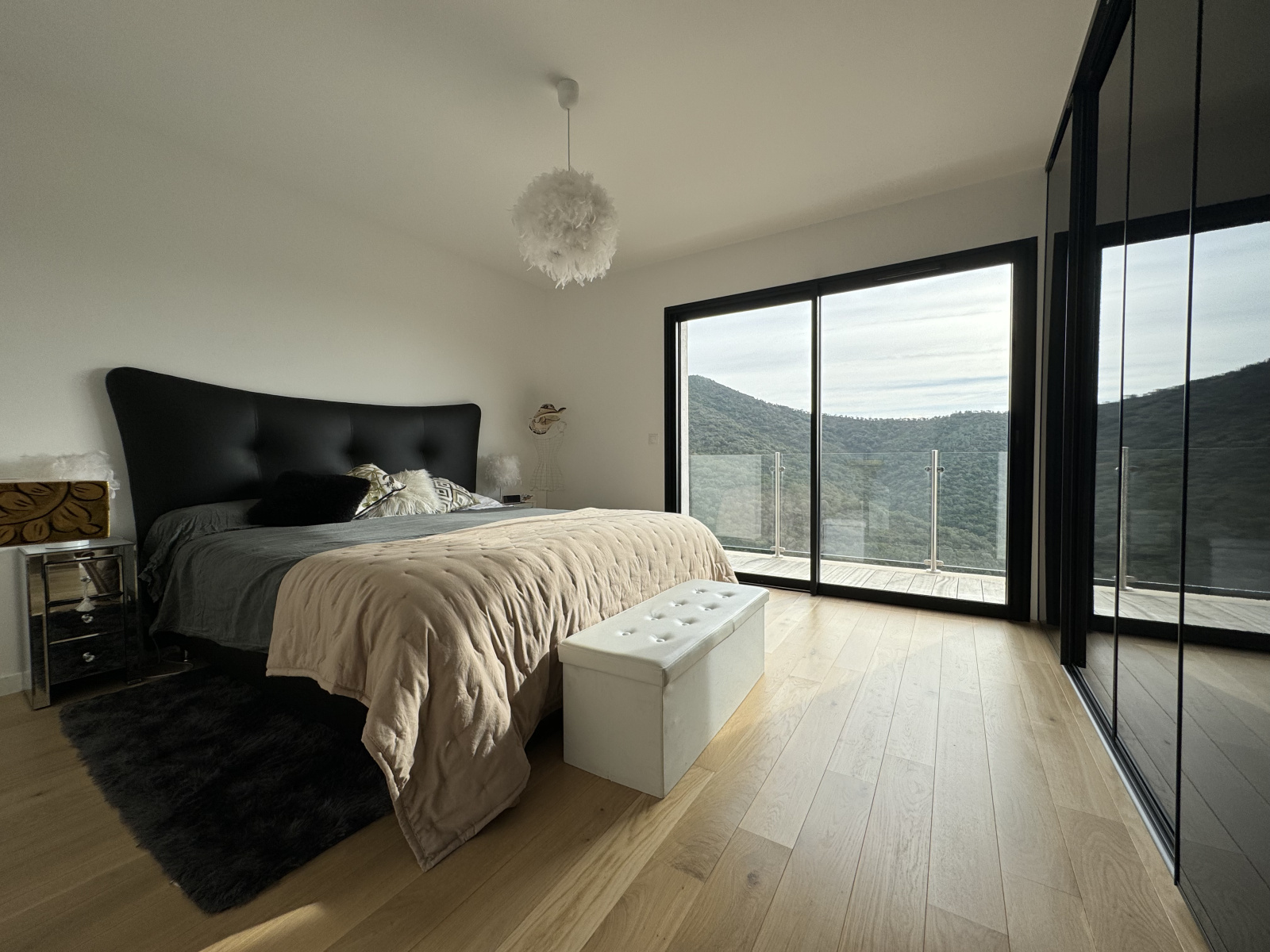 À l'étage, un palier distinct sépare habilement les espaces de vie et de repos avec un puit de lumière. La partie vie de 60 mètres carrés, exposée plein sud-est pour profiter pleinement du soleil, comprend une salle à manger somptueuse, une cuisine ouverte et entièrement équipée avec buanderie attenante, ainsi qu'un salon élégant, tous s'ouvrant sur les terrasses ensoleillées et la piscine à débordement en pierre balinaise. Un couloir conduit à la partie nuit, où se trouvent un WC séparé, une première suite avec salle de bain, une seconde suite avec salle d'eau, et enfin, une magnifique master de 30 mètres carrés avec double dressing, salle d'eau privative et terrasse panoramique.
